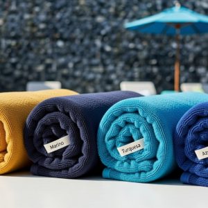 Toalla fabricada en 100% algodón de 350 g/m2, especial para marcaje en jacquard (tejido) hasta 2 colores. En la cara trasera de la toalla se verá el logotipo con los colores invertidos.Disponible en varios tamaños y presentada en bolsa reciclada, con opción de presentación en bolsa de redecilla con cordón de transporte y ajuste. Etiqueta de lavado y cuidados incluida. Pedido mínimo 2500un. Solicite presupuesto ahora.