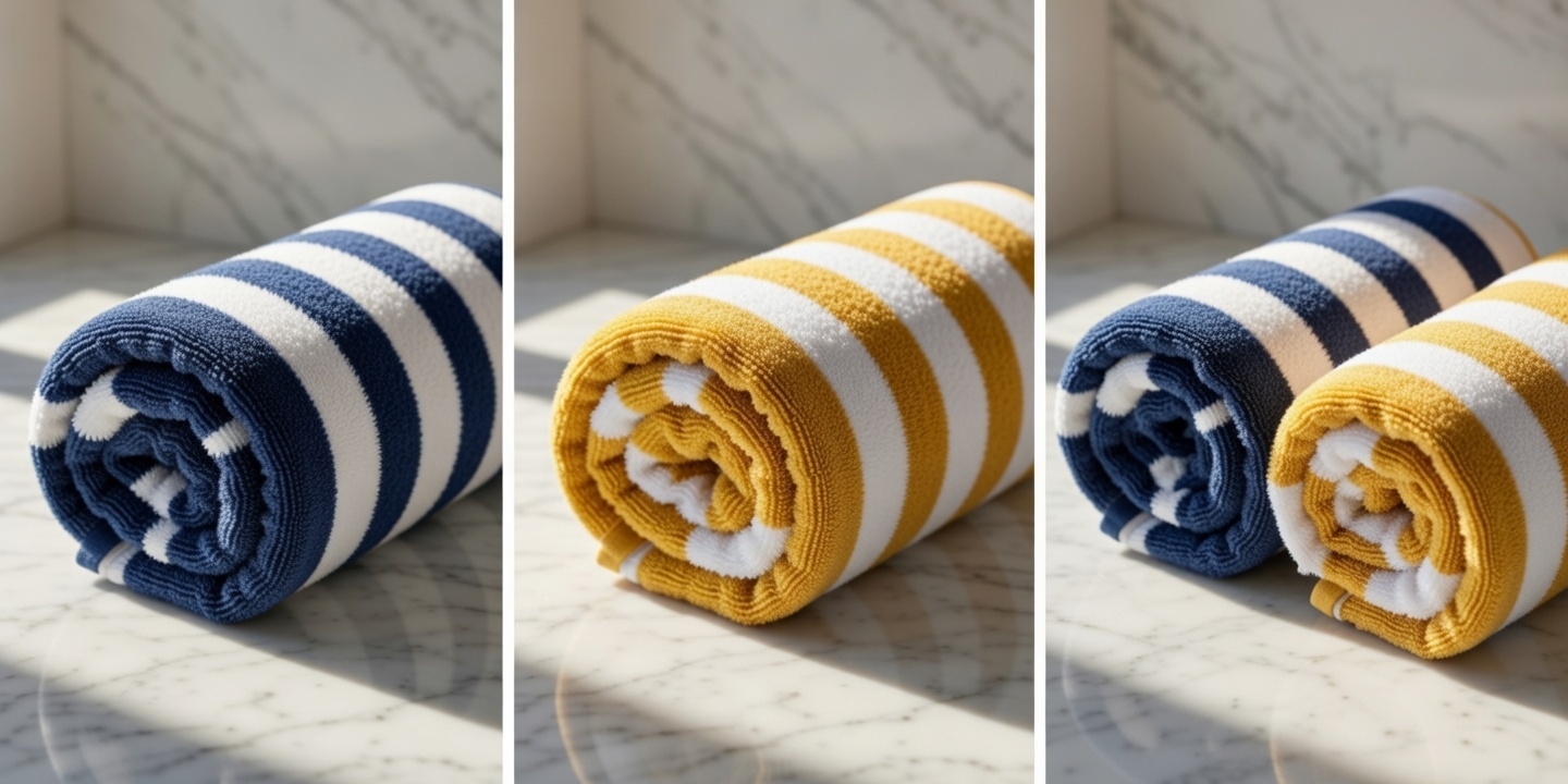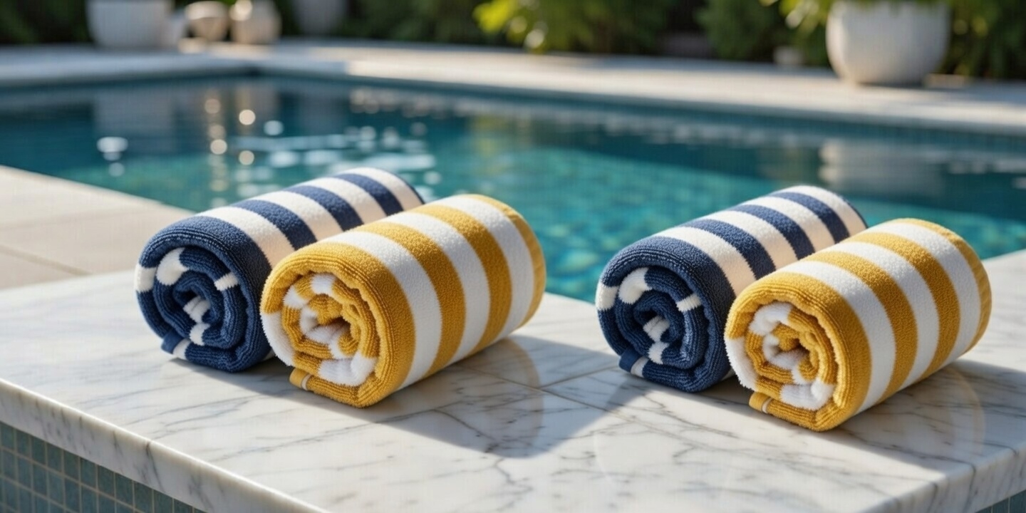 Toalla de piscina a rayas confeccionada en rizo EXTRA 30/2, elaborada con algodón reciclado, que ofrece alta absorción, suavidad y resistencia. Cuenta con confección de doble pespunte de seguridad, garantizando mayor durabilidad incluso con uso intensivo. Con un gramaje de 480 g/m², proporciona un tacto confortable y una excelente capacidad de secado. Disponible en medida 100 × 170 cm y en dos combinaciones de color: azulina y amarillo, es ideal para piscina, playa y uso profesional.