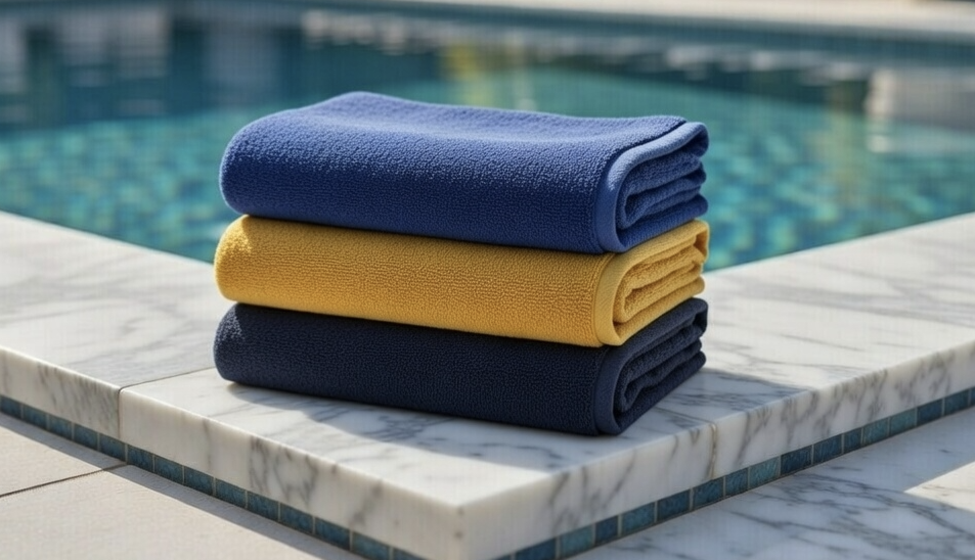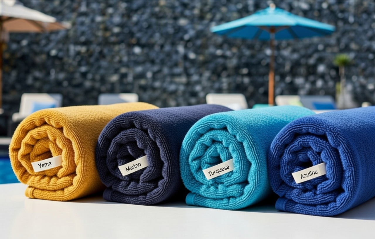 Toalla de piscina a rayas confeccionada en rizo EXTRA 30/2, elaborada con algodón reciclado, que ofrece alta absorción, suavidad y resistencia. Cuenta con confección de doble pespunte de seguridad, garantizando mayor durabilidad incluso con uso intensivo. Con un gramaje de 480 g/m², proporciona un tacto confortable y una excelente capacidad de secado. Disponible en medida 100 × 170 cm y en dos combinaciones de color: azulina y amarillo, es ideal para piscina, playa y uso profesional.