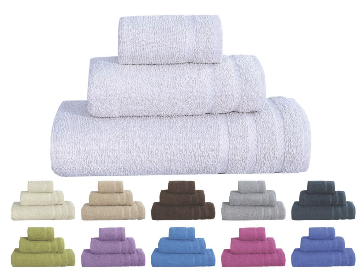 Toallas en algodón 100% de 400grm2 de Rizo. Producto de primer precio dotado de una banda lisa de 8cm de ancho que se adapta a cualquier tipo de personalización. Disponible en un amplio abanico de colores, pertenece a una gama completa de toallas que van de la de tocador a la de baño. Toalla con certificado Oeko-Tex & Peta.