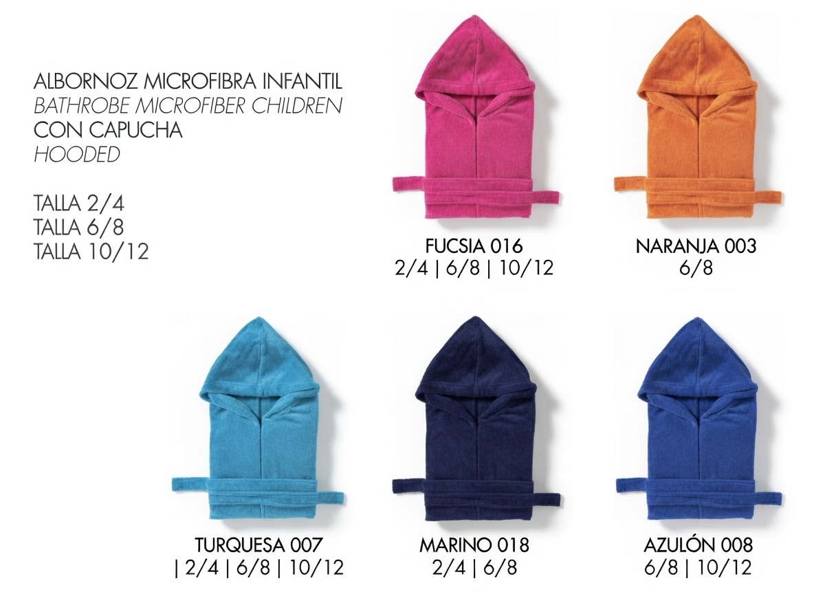Albornoz infantil de microfibra, fabricado en 100% poliéster con un suave acabado «piel de melocotón». Este textil combina suavidad, resistencia y una excelente capacidad de absorción, ideal para brindar confort a los más pequeños. Disponible en tallas: 2/4, 6/8, 10/12 y 14. Perfecto para envolver a los niños en comodidad después del baño.
