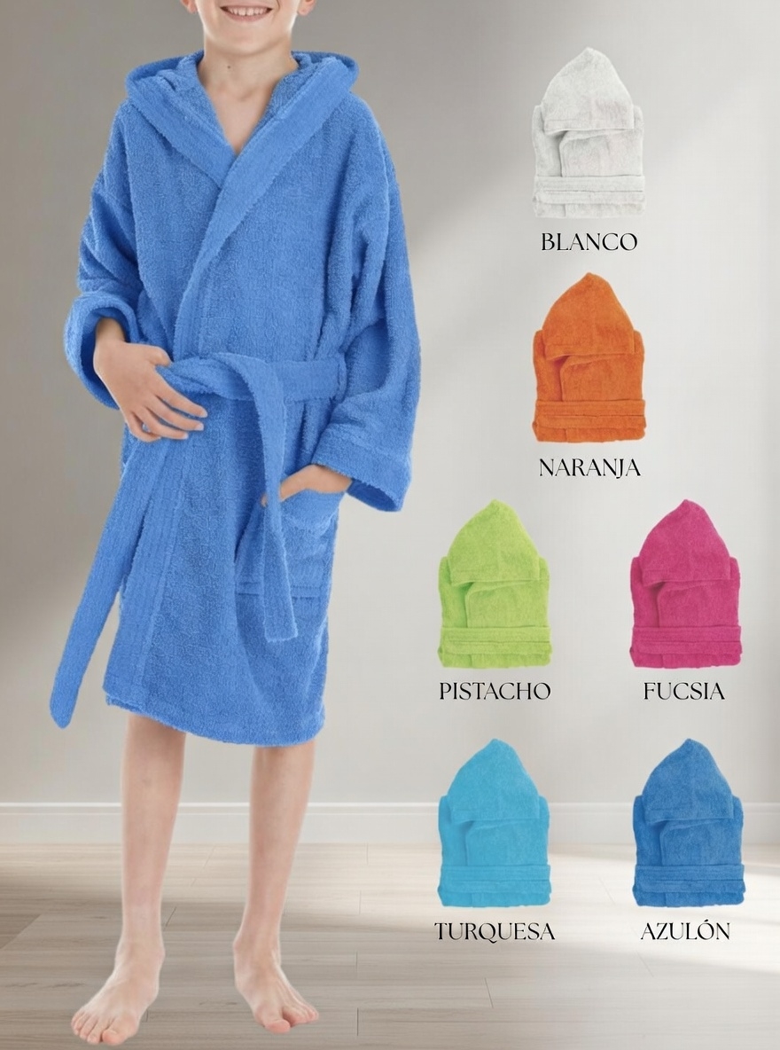 Albornoz infantil de rizo con capucha, confeccionado en 100% algodón de 400grm2. Este albornoz es suave, absorbente y perfecto para mantener a los niños cómodos y abrigados después del baño. Su capucha añade un toque extra de confort y protección. Ideal para los más pequeños, ofreciendo calidad y calidez en cada uso.