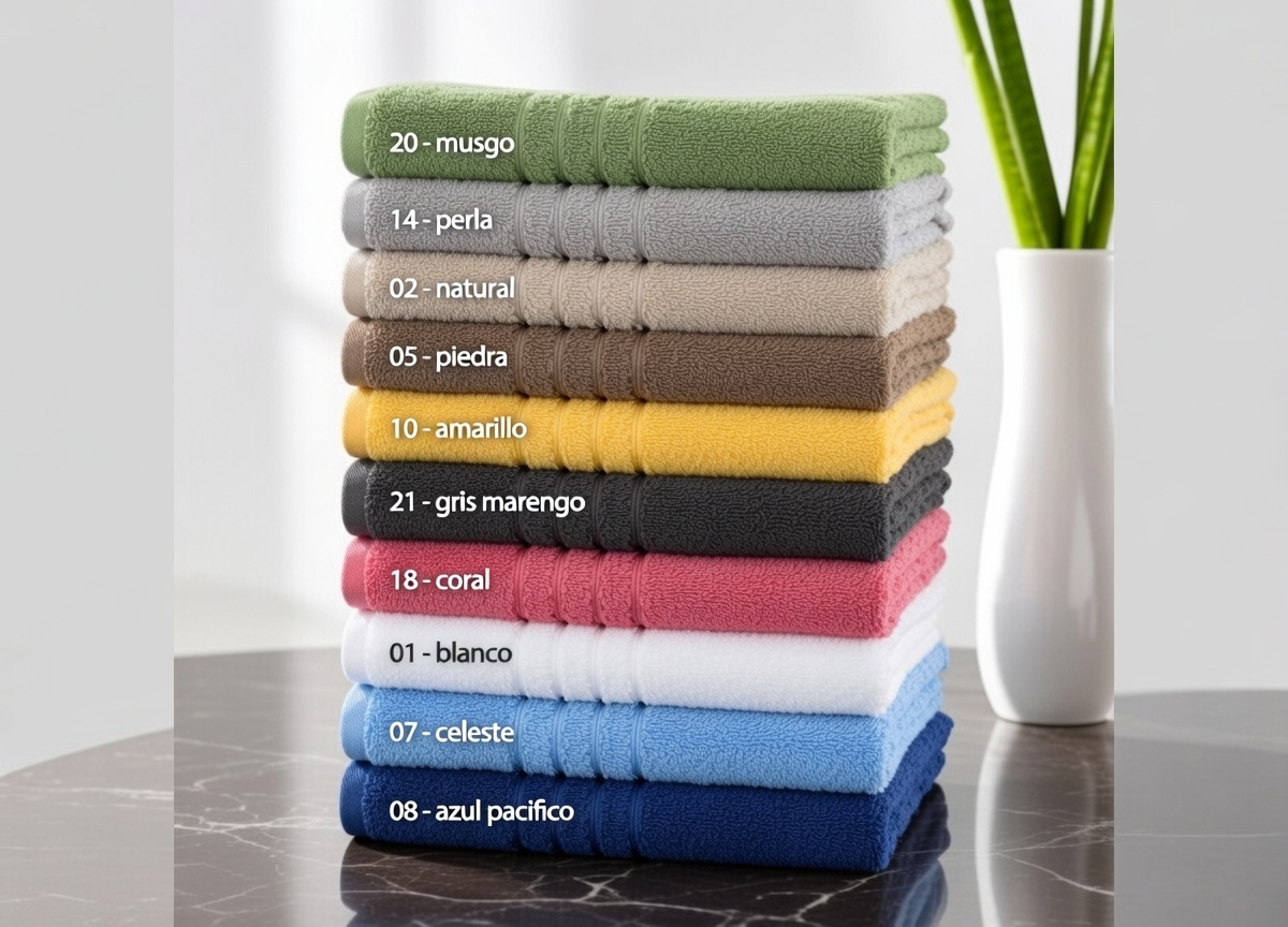 Toalla de Rizo Americano 450 gr/m², confeccionada en 100% algodón para garantizar suavidad, absorción y resistencia. Su tejido de alta calidad proporciona un secado eficiente y una sensación agradable en cada uso.